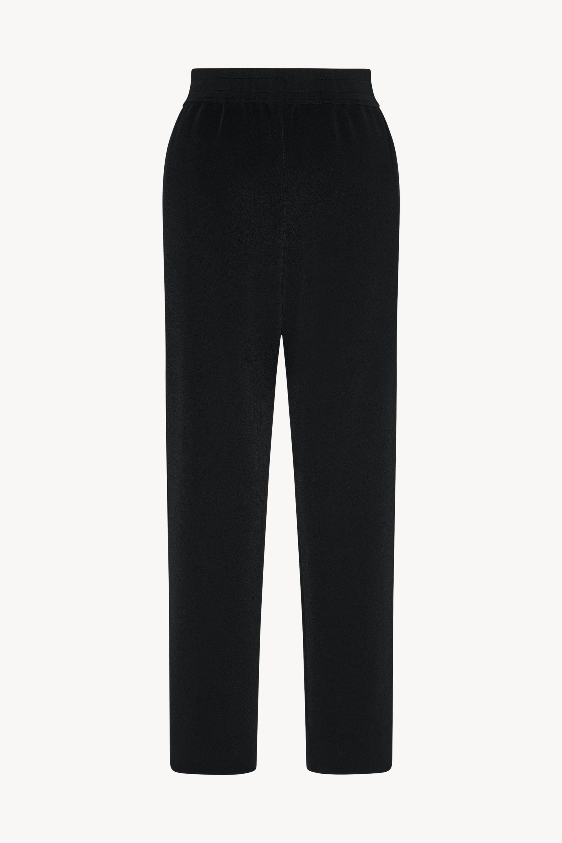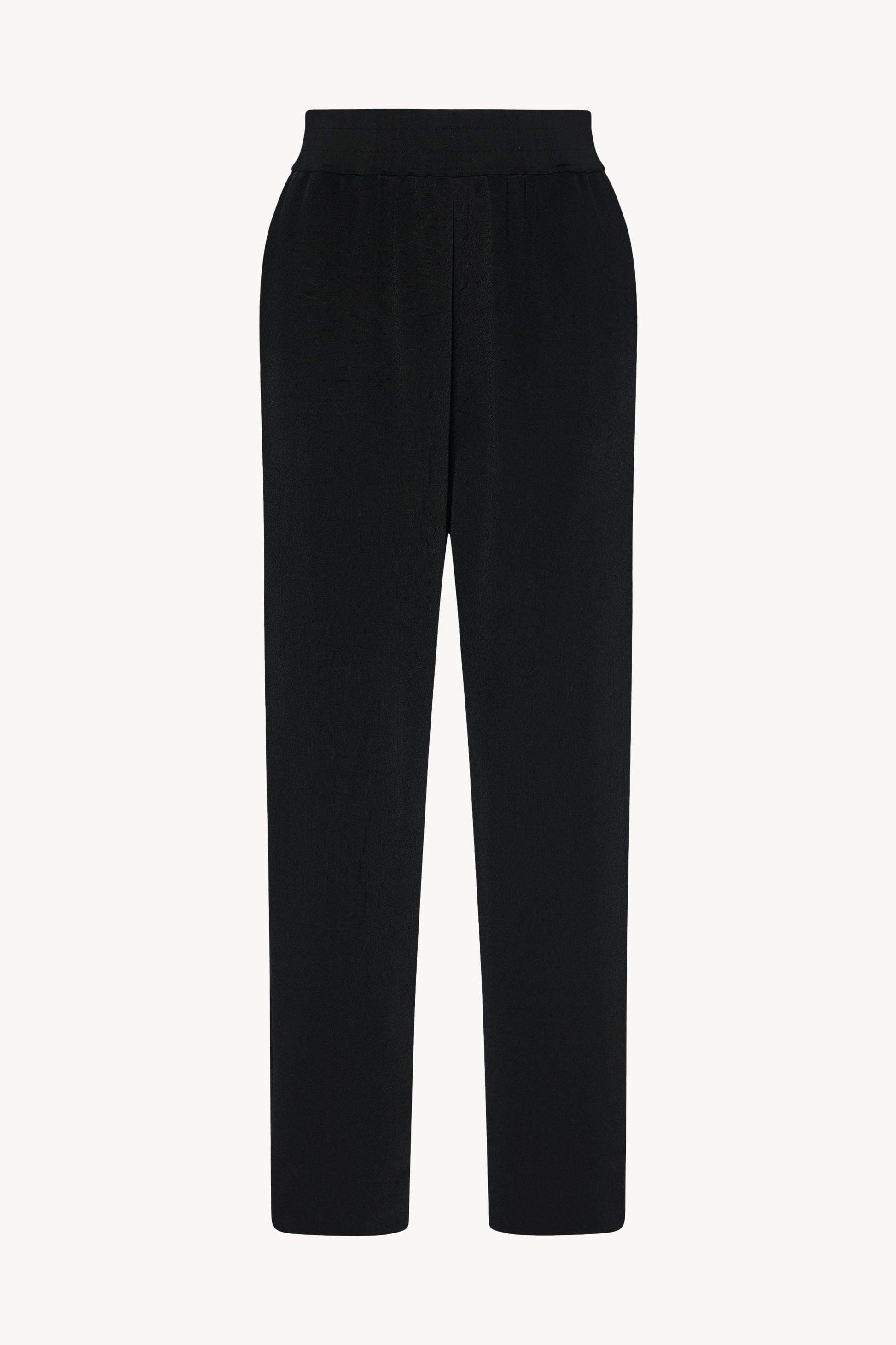 Mid-rise pull-on pant in double-faced jersey with tapered leg and topstitched elastic waistband.